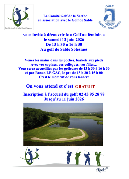 Le Comité Territorial de Golf Sarthe-Mayenne, en association avec le golf de Sablé-Solesmes vous invite à découvrir le Golf au Féminin le samedi 13 juin 2026 de 13h30 à 16h30, animation gratuite.